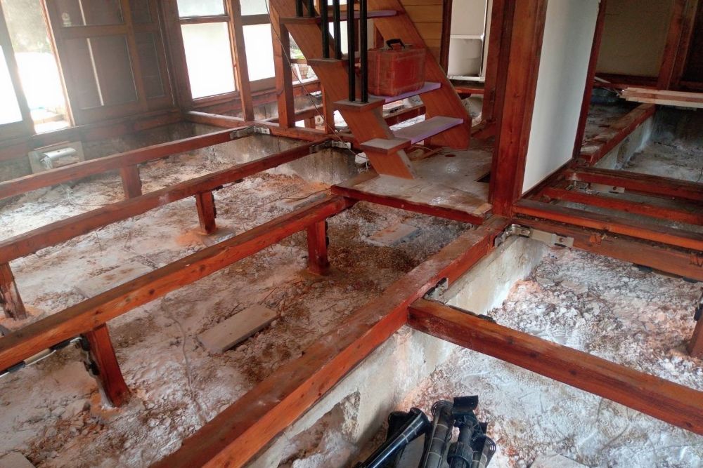 前所有者様が残された大量の物品を片付けて完全に空っぽのまさしく空き家となり、まずは1階の床や一部の壁を取り除き、床下の基礎部分や柱が姿をあらわしました。いよいよ再生の始まりです。シロアリ被害を予防するための防蟻剤を塗布したり、床下の消毒やカビ防止に石灰を散布したり…家の基礎となる部分に取り掛かります。