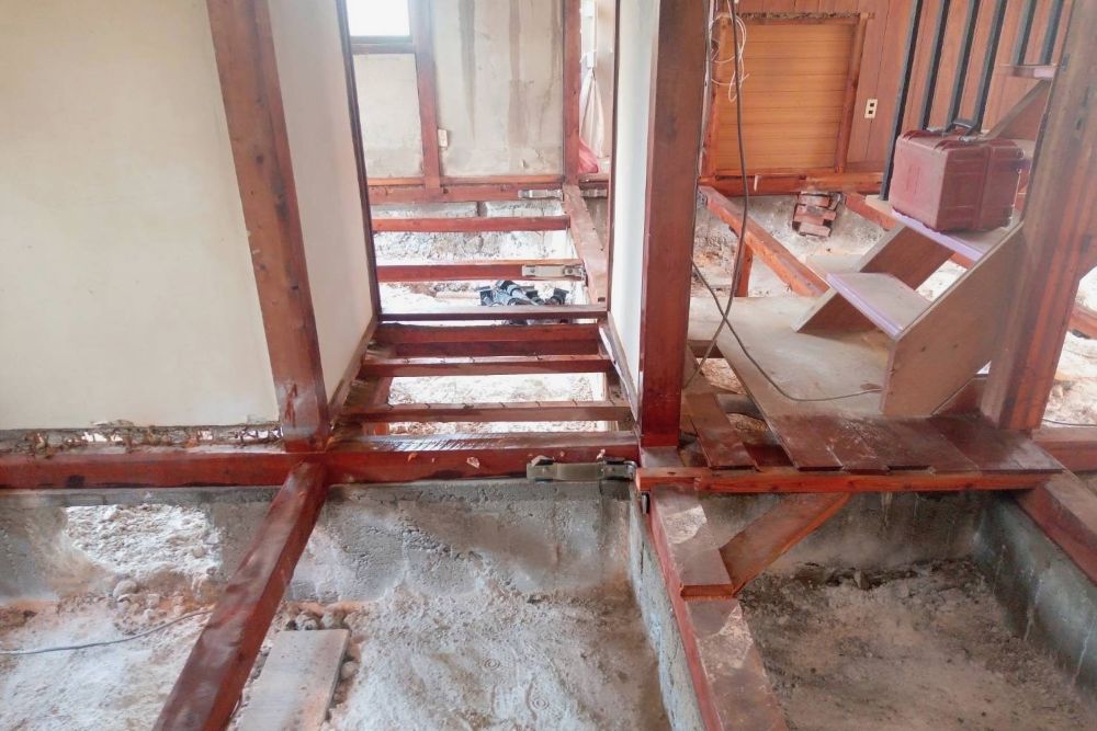 前所有者様が残された大量の物品を片付けて完全に空っぽのまさしく空き家となり、まずは1階の床や一部の壁を取り除き、床下の基礎部分や柱が姿をあらわしました。いよいよ再生の始まりです。シロアリ被害を予防するための防蟻剤を塗布したり、床下の消毒やカビ防止に石灰を散布したり…家の基礎となる部分に取り掛かります。