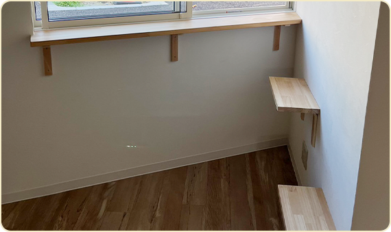 猫の居場所や動線づくりにぴったりのインテリアカウンター。木目のやさしい風合いがオシャレ空間を演出。水や汚れが浸み込みにくい塗装が施されているので、水まわりでも安心して設置できます。