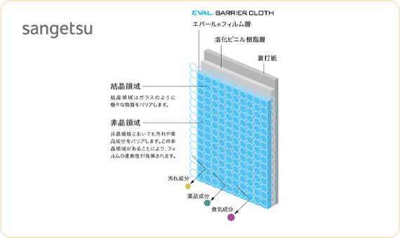 エバール®フィルムの強度とキズがつきにくい表面構造により耐久性をさらに向上させた壁紙です。一般ビニル壁紙に比べ、高い耐衝撃性能を有し、汚れにも強く、防臭効果も期待できます。また、耐薬品性と抗菌性にも優れているので、メンテナンスしやすく清潔な環境をキープすることができます。