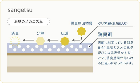 表面に加工している消臭剤が悪臭原因物質と化学反応し吸着・分解することで、消臭効果が得られる仕組みです。効果は環境によって異なりますが、約5〜10年持続します。 トイレ、生ゴミのニオイやペットのニオイを吸着・分解し、シックハウス症候群の原因となるホルムアルデヒドの低減に効果があります。